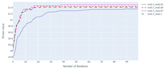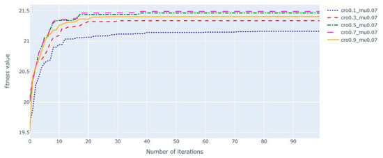 The genetic algorithm was optimized by running multiple iterations of a simulation to assess the effects of algorithm parameters, including the number of generations, mutation rate, and crossover rate. Stable results were achieved using 100 generations, and the best learning results were achieved using a crossover rate of 0.7 and a mutation rate of 0.07 (see Figure 6, Figure 7 and Figure 8).