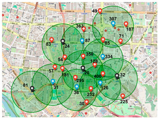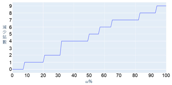 The performance of the proposed system was assessed quantitatively using simulations based on historical YouBike data in Da’an District, Taipei. As shown in Figure 9, this evaluation involved calculating the number of stations requiring manual adjustments as a function of the user compliance rate (ω%).