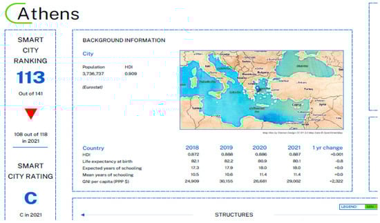 The IMD Smart City Index [68] assesses the perceptions of residents on issues related to structures and technology applications available to them in their city and it is based on the Structures pillar (city infrastructure) and the Technology pillar (technological parameters). Since 2019, the IMD has produced this index in respect of the economic, technological, and social aspects of smart cities. According to the 2023 index, Zurich is taking the lead in the global smart cities market and was named the world’s smartest city for 2023. In fact, Zurich managed to displace Oslo, which held the scepter in 2021. Europe manages to distinguish itself globally from the smart services that cities provide to their residents, as eight of the ten smartest cities on the planet are in the European area. For example, Copenhagen (4th in the 2023 ranking), Lausanne (5th), and London (6th) are high performers, while Helsinki (8th), Geneva (9th), and Stockholm (10th) complete the “top 10” of the world’s smartest cities for 2023. The Greek capital (only this Greek city is included in the index) is low on the list of the world’s elite metropolises that are championing smart cities. For 2023, Athens is ranked 113th (Figure 2) out of the 141 smartest cities in the world. In fact, Athens, according to the assessment, loses five places in this year’s rating, as in 2021 (when the last measurement was made), it was ranked 108th worldwide. Athens’ subdued performance this year puts it lower in the ranking, under cities such as Bucharest (104th), Cairo (108th), and Sofia (111th).