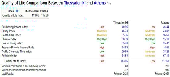 For 2024, Greece is ranked 47th out of the 85 entries with 127.2 points, while Switzerland is ranked 7th with 186.7 points and Luxembourg is on top of the list with 207.3 points [70]. Additionally, when comparing the quality of life between the two major cities in Greece, Athens and Thessaloniki (Figure 4 [71]), we can see that their ranking is below the national score of 127.2 points (117.6–113.06) and the quality-of-life index in both cities is described by the tool as low, in respect of the IMD Smart City Index mentioned earlier. Although there are not enough data for all the Greek cities, the best achieved score is measured in Heraklion, Crete, with 155.65 points and a high index description [72].