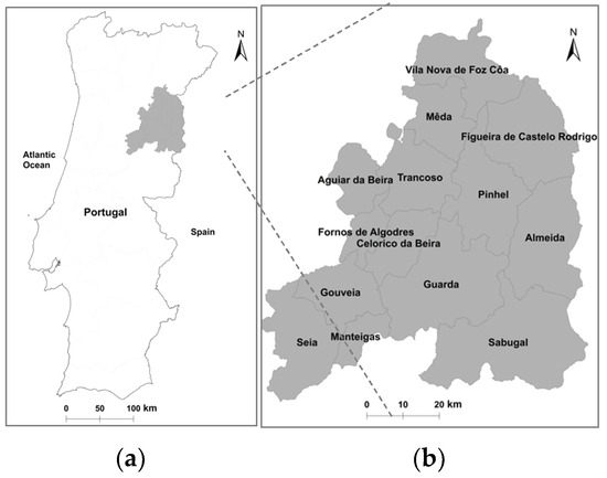 Study area. Geographical framework of the Guarda District (highlighted in gray) in Portugal (a); municipalities of Guarda District (b).