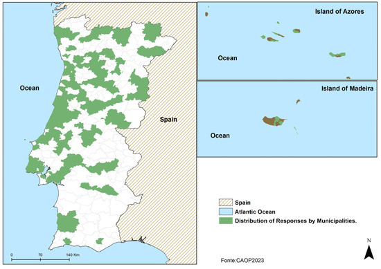 This exploratory investigation was based on applying a semi-structured online questionnaire aimed at philharmonic bands in Portuguese territory after evaluating two philharmonic bands to improve the survey. The questionnaire addressed three fundamental areas: social impacts (participation, social interactions and the recruitment of new members), musical and artistic impacts (quality of performances, adaptation to new rehearsal and performance formats) and economic and financial impacts (financial stability, dependence on institutional support and financing strategies). The questions were structured to cover distinct roles within associations, such as musicians, leaders and conductors, to capture a broad and diverse view of the effects of the pandemic. The questionnaire was distributed to all bands in Portugal, resulting in 350 responses. The data collection process ensured representation of the country’s different regions (Figure 1), in addition to allowing a comprehensive territorial analysis of the effects of the pandemic. The questionnaire, in a mixed approach, included several multiple school questions and open-ended questions, thus allowing data related to the complexity of the problems to be obtained.