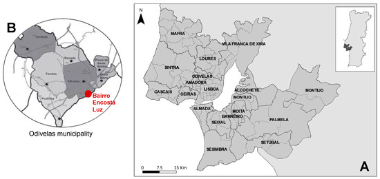 The study area, Bairro Encosta da Luz (BEL), is located within the municipality of Odivelas (Figure 1). Odivelas, one of the 18 municipalities comprising Lisbon, the capital of Portugal, is a participant in the United Nations’ “Resilient Cities” program [3]. Covering an area of 26.4 km2, the predominantly urban municipality of Odivelas comprises seven parishes (Figure 1). Odivelas ranks as the 15th most populous municipality on mainland Portugal, with 148,034 inhabitants, 47.1% of whom are male and 52.9% female [4].