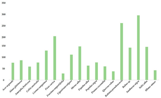 Two years after the removal of alien species, the regeneration index (IR) for both A. fruticosa and A. negundo showed a substantial decline from 31.75 and 21.12 cm m−2 to 2.07 and 2.6 cm m−2, respectively. Concurrently, space was created to expand native tree species such as C. sanguinea, M. alba, and P. alba. The results indicate that the regeneration of P. alba is currently the most extended (31.1%) in the alluvial forest, with C. sanguinea, M. alba, and A. glutinosa regeneration also showing significant extension. In contrast, the regeneration of F. angustifolia remains very limited (0.21 cm m−2), signaling the need for targeted restoration actions.