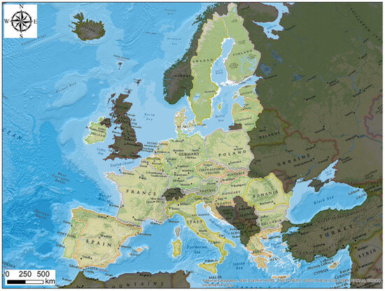 The values of the input parameters for the present study were acquired from different data sources, as described in Table 1. All geospatial datasets used in this study are widely applied in erosion modeling, especially for large-scale assessments [7,15]. The datasets were organized into GIS thematic layers in ArcGIS (v10.2) and the raster calculator tool was employed to estimate the SC values, and statistics for each country were exported. The output pixel size for SC services was set to 100 m, which is considered optimal [7]. Additionally, the standard European Coordinate Reference System was adopted, utilizing the European Terrestrial Reference System 1989 (ETRS89) datum and the Lambert Azimuthal Equal Area (LAEA) projection (EPSG: 3035).