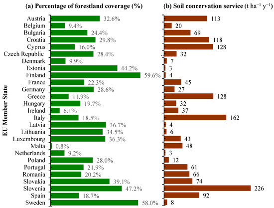 (a) Percentage of forestland coverage within FUAs and (b) supply of SC services from UPFs in EU member states.
