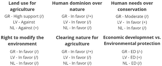 To achieve the aim of the study and examine any possible co-existence between the biocentric (pro-environmental) and human-centered (anti-environmental) perceptions, a questionnaire was developed. The questionnaire was presented in English to students from all three countries (Greece, Latvia, and the Netherlands) who have a vested interest in climate change given its alarming nature and the considerable attention it has garnered in discussions nowadays. The observed countries (the Netherlands, Greece, Latvia) have distinct differences in the demographic factors [7], which implies that there would be differences in the students’ opinions about biocentrism and anthropocentrism. Nonetheless, it is hypothesized that in this world of increasing multiculturalism and individualism [8,9] there is the possibility that the idea of preservation for the three countries is following a simple continuum. The questionnaire items were developed using a five-point Likert scale; the lowest value represented strong disagreement (1) and the highest value represented strong agreement (5). The final version of the questionnaire had seven small sections: The first section (1) contained general information about the participant, such as their ethnicity, age, and field of education. The following five sections (2–6) are five different components that were tested to investigate the Environmental Attitude of the students from the three countries: intent of support, care for resources, enjoyment of nature, altering nature, and dominance over nature.
