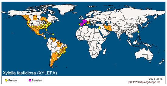 - Xylella fastidiosa (XYLEFA) [World Distribution] | EPPO Global Database. Available online: https://gd.eppo.int/taxon/XYLEFA/distribution (accessed on 9 September 2024).