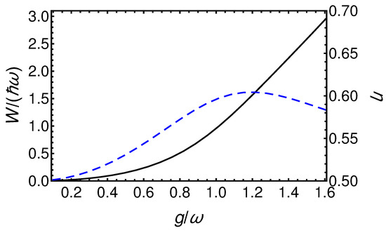 The Rabi Hamiltonian has been recently exactly diagonalized [8,9]. This let us write its ground state in the bare basis and, thus, calculate the extracted work and the efficiency of the protocol when applied to the Rabi model at zero temperature. The graph of Figure 2 shows both the amount of extracted work and the ideal efficiency as a function of the coupling parameter in units of . As one can see, the extracted work is comparable with the typical energies of the two subsystems when is sufficiently high. We remark that these high values of the coupling constant became recently experimentally attainable [10]. Moreover, the efficiency of the thermalization protocol is always higher than one half, with a peak of roughly 0.60.