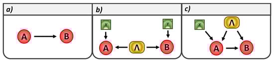 For instance, the causal model represented in Figure 1a is compatible with any joint distribution of A and B and, if one wants to determine whether an event A affects or not an event B, observational data is not enough, one has to resort to interventions []. In turn, the causal models in Figure 1b,c have testable constraints already at the level of observational data. Hence, the simplest model, in terms of the number of nodes within the corresponding Directed Acyclic Graph (DAG) [], to which we must resort to exclude that a variable A is affecting a variable B is the instrumental process (see Figure 1c), that admits the instrumental inequalities [,,]. This makes the instrumental causal model an essential tool in a wide range of fields, from economics to medicine, as it allows to estimate causal dependencies even in the presence of unobserved common causes.