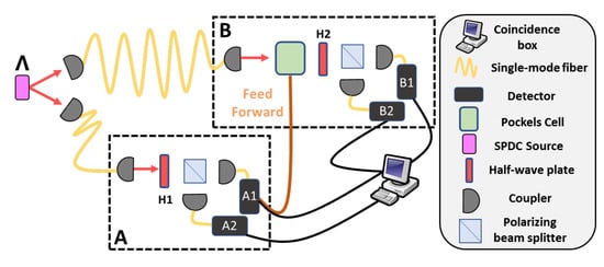 Photon pairs were generated in a parametric down conversion source, composed by a nonlinear crystal Beta-Barium Borate (BBO) of 2 mm-thick injected by a pulsed pump field with 392.5 nm. After spectral filtering and walk-off compensation, photons of 785 nm are sent to the two measurement stations A and B. The crystal used to implement active feed-forward is a LiNbO3 high-voltage micro Pockels Cell made by Shangai Institute of Ceramics with <1 ns risetime and a fast electronic circuit transforming each Si-avalanche photodetection signal into a calibrated fast pulse in the kV range needed to activate the Pockels Cell is fully described in [,]. To achieve the active feed-forward of information, the photon sent to Bob’s station needs to be delayed, thus allowing the measurement on the first qubit to be performed. The amount of delay was evaluated considering the velocity of the signal transmission through a single mode fiber and the activation time of the Pockels cell.
