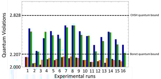 Experimental results. In this plot we show the experimental quantum violations of Bonet and CHSH inequalities obtained from 16 experimental runs in the post-selection regime (for both scenarios the classical upper bound is 2). In purple and blue, we show respectively the Bonet’s and CHSH violations obtained through the apparatus described in Figure 2 section, keeping the Pockels cell switched off and performing Alice’s and Bob’s measurements, rotating the HWPs. In orange, we show the extent of the Bonet inequality’s violation that can be obtained from the probabilities p(a,b|x,y) belonging to the CHSH scenario. In green, we show the CHSH violation obtained on an instrumental process platform, through an alternative procedure which does not require the correlations between all of the 4 combinations of the inputs (x,y).