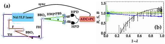 , cut angle = 46.7 deg, 6-mm long). Two twin portions at frequency degeneracy, i.e., at 523 nm, were then spectrally and spatially filtered. We simulated the asymmetric lossy channel by inserting in one of the twin arms a half-wave plate (HWP) followed by a polarizing cube beam splitter (PBS). We changed the amount of loss by rotating the HWP by 50 deg in steps of 2 deg. For each angle, 100,000 acquisitions were performed. As the detectors we used two hybrid photodetectors (HPDs, mod. R10467U-40, Hamamatsu Photonics), whose outputs were amplified, synchronously integrated and digitized (ADC + PC). As already explained elsewhere [