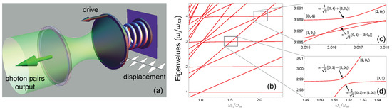 Eigenvalues of as a function of for fixed G and are reported in Figure 1b, showing the appearance of a peculiar avoided level crossing between states with 2 photons and 4 phonos, and between 2 photons and 3 phonons (magnified in Figure 1c,d). In general is able to induce resonant optomechanical scattering processes involving , where n (k) labels the photon (phonon) state, the subscript indicates which mechanical manifold is considered, and q is an integer number. Such avoided crossings occur when the energies of the final and initial states coincide, i.e., , marking the coherent exchange of excitations between light and mechanical oscillator. This result shows that the main difficulty for the detection of mechanical DCE, namely very large mechanical frequency are not necessary, is overcome since can be also smaller than even for . Of course for larger q the induced level splitting decreases, and the dynamical detection may become fragile with respect to the decoherence and losses, but for , the splitting is still larger than the losses rate achievable with the best state-of-art optomechanical systems. The reversible dynamics subsumed by , can be tested either by preparing the system in one of the mechanical Fock state and let it evolve, or by an external coherent drive (pulsed or continuous) exciting the oscillator and detecting the photon-conversion of the excitation. In both cases measurement of the generated Casimir photons requires that the optomechanical system is viewed as an open quantum system, whose dynamics is described by a Master Equation accounting for the generalized photodetection scheme appropriate for USC [15].