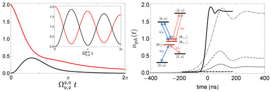 where is the splitting between levels respectively, and g is the coupling between the mode and the transition. Eigenstates of are partitioned in two sets: (1) factorized states , where is a Fock state, with energy ; (2) eigenstates of the two-level Rabi model with eigenvalue . Due to USC these latter are strongly entangled atom-mode states, dressed by by virtual photon pairs. A unique signature of USC in is the fact that the presence of virtual photon pairs allow in principle to transfer population from to [12]. Coherent amplification of this channel is obtained by using STIRAP. We first consider the configuration, where (see the inset of the right panel of Figure 2). The atom is prepared in and driven by an electric field yieldind , where is the ratio between atomic dipole matrix elements and is a two-tone signal. STIRAP is obtained by taking , and the envelopes where is the Stokes/pump field amplitude, is the delay, T is width of the pulses [16,25]. It may yield coherent population transfer iff , i.e., the Rabi ground state contains pairs of virtual photons. The evolution of the average number of photons in this case is shown in Figure 2 (right panel, dot-dashed gray curve). Calculations are carried out for , and . Field amplitudes and are chosen such that they yield the same Rabi frequencies for the relevant transitions, large enough to guarantee adiabaticity, , with delay . Absolute times reported in the figure correspond to .
