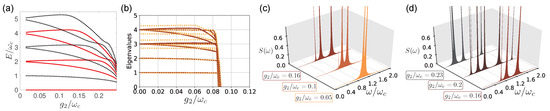 where we defined the cavity and qubit frequency, and the two-photon coupling strength . Notice that in the literature the TPI term is often written as , whereas we take here the interaction Hamiltonian to be in the full-quadratic form. The latter form of the interaction arises when the qubit is coupled to the square of the electric (or magnetic) field of the cavity mode and it is therefore a natural generalization of the standard dipolar coupling [19]. The system spectrum is shown in Figure 1a,b for and , as a function of the coupling strength . The spectral collapse takes place for the critical value of the two-photon coupling strength , which depends only on the cavity frequency and on the number of atoms. At the collapse point, the spectrum is composed of a finite number of discrete levels and of a continuous energy band [2,3,4,5,6,7,8]. For larger values of the coupling strength the spectrum is unbounded from below and thus the model is no longer well defined. In Figure 1b we plot the spectrum also in the case in which direct inter-atomic interactions have been included (dashed yellow line). This shows that qubit-qubit interactions do not affect the onset of the spectral collapse, in contrast with the superradiant phase transition of the standard Dicke model, where inter-atomic couplings inevitably inhibit the transition [21].