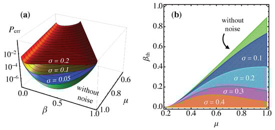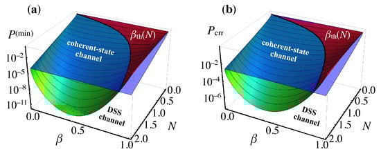 In PSK coherent-state communication, one should discriminate between the two symbols , , where is the displacement operator, and the assumption holds without lack of generality. In our analysis, we require that the binary information is encoded exploiting DSSs, i.e., , , where is the squeezed vacuum, being the squeezing operator. Moreover, we assume without lack of generality the squeezing parameter . In the following, as a figure of merit we consider the discrimination error probability as a function of the total energy N and of the squeezing fraction , where is the number of squeezed photons. Given the two states , , the minimum error probability is given by the Helstrom bound , assuming equal prior for the two signals [3]. As shown in Figure 1a, where we plot for the DSSs and coherent states as a function of N and , it is possible to find a threshold value of the squeezing fraction such that the error probability for a pair of DSSs is smaller than the corresponding coherent case [6,9]. The minimum of is instead achieved for . For a homodyne receiver, one still finds the same threshold for the corresponding homodyne-detection error probability (see [9] for the details about the calculation of the corresponding ). However, the scalings of and are different, as shown in Figure 1b. In the presence of phase noise, the state is substituted by the density operator [8]