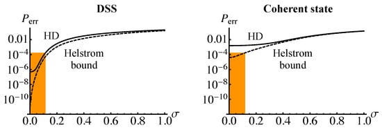 Comparison between the error probability (solid lines) and the Helstrom bound (dashed lines) as functions of the noise parameter for the DSS and the coherent state. We set and . The shaded region refers to the range of the noise parameter values such that the homodyne probability with DSS is below the Helstrom bound with coherent states. Figures adapted from [9].