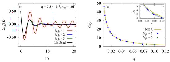 We fix and the transverse field equal to a constant, i.e., , and study the dynamics of the unbiased SBM. We choose the cut-off frequency , the coupling parameter in the range , and focus on the case of Ohmic dissipation. We report the results of the dynamics of the expectation value at computed by means of the SIL method, compared with the predictions based on the adiabatic Lindblad equation. In addition, we plot the quality factor of as a function of the coupling strength .