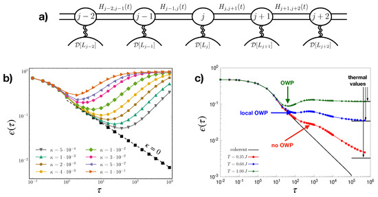 In the absence of dissipation (), one finds a Kibble–Zurek (KZ) scaling of the excess energy with the QA speed , i.e., , which is obtained via knowledge of the Ising critical exponents associated with the corresponding transition at [6]. Such relation can be generalized to the case of initial thermal states, renormalizing the power-law scaling exponent [19,20]. On the other hand, a finite dissipation () may induce a competition between the generation of defects by means of KZ and incoherent driving. This typically manifests in a nonmonotonic behavior of the curves in Figure 1b, thus producing an optimal working point (OWP) that maximizes the QA performance [21]. The behavior of the OWP position with can be predicted by assuming independence between the two mechanisms: this is due to the choice of the bath, which is insensitive to the Hamiltonian details [9]. A more thorough modelization of dissipation, in terms of an independent Caldeira-Leggett Ohmic bath per cavity, gives rise to situations where the OWP may disappear [10,22], for low bath temperatures [see Figure 1c]. At intermediate temperatures, the curve for the excess energy in function of displays a local minimum at finite , but the actual global minimum is attained as a thermal plateau [10]. The additivity of the two above mentioned mechanisms breaks down as soon as the bath thermalization time is effectively shorter than the characteristic timescale for the system dynamics.