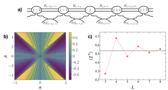 where . Hereafter we adopt units of . The first term in the r.h.s. of Equation (2) describes the coherent evolution driven by Hamiltonian (1). The second term corresponds to the unavoidable coupling of each cavity to an independent bath (with strength ). We model this as a Lindblad jump operator , whose effect is to incoherently deplete the jth cavity [see the sketch in Figure 1a]. The third term accounts for an engineered two-site dissipation: