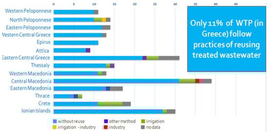 Wastewater is an effective alternative water supply, which lowers the pressure on natural water bodies and enhances the EU’s ability to adapt better to climate change challenges. Reusing water after appropriate treatment extends its life cycle, thereby preserving the use of virgin water resources. Treated wastewater is predominantly utilized for non-potable applications, such as agricultural irrigation, land enhancement, groundwater recharge, golf courses irrigation, vehicle washing, toilet flushing, firefighting, and construction activities. It also finds applications in industrial cooling processes, particularly in thermal power plants [6]. More than 58,000 wastewater treatment plants are included in the global database HydroWASTE [7].The reuse of treated wastewater has grown rapidly in recent years, with annual increases in usage ranging from ~10% to 29% in regions such as Europe, the USA, and China, and up to 41% in Australia [6]. In Asia, China leads the wastewater reuse efforts, irrigating approximately 1.3 million hectares of agricultural land. In Greece, there are currently 240 WWTPs registered in the National Monitoring Database, but only 11% follow the practices of reusing the treated wastewater (Figure 1).