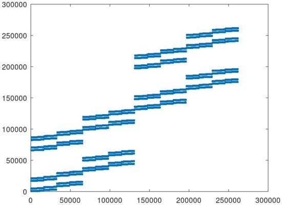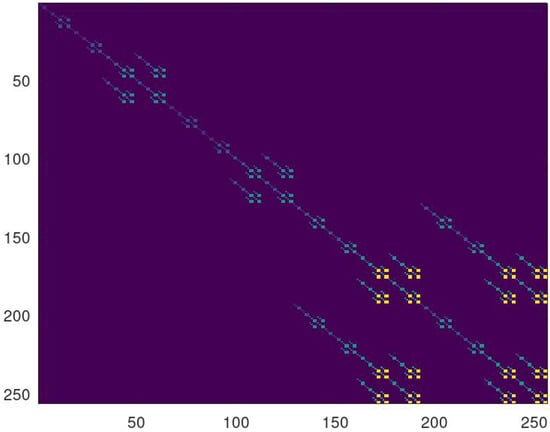 with zero and all ones () blocks. The repeated Kronecker product of the above will provide all possible accumulators denoted by in Section 2.3 as logarithms of all final matrix elements greater than one. Results for a 4-fold product are shown in Figure 2.