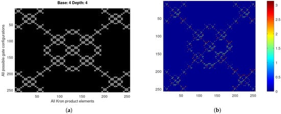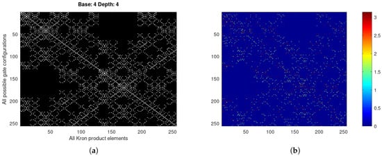 For all possible Kronecker product sequences of length l constructed from a finite set of b gate elements, this will naturally lead to a hierarchy of matrices , each of which contains all possible sequential Kronecker products of k elements in parallel with b denoting the base of an appropriate alphabet defined by the cardinality of some finite set of parametrizations of the same universal gate. We also assume the restriction with even cases being covered by taking an excess ‘inert’ qubit.