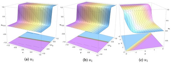 Figure 1 represents solutions (33), where , , and show the kink solitary wave solutions. Among them, is the x-t plot, is the y-t plot, and is the x-y plot. The parameters for are: , , , with bounds , . For : , , , with bounds , . For : , , , with bounds , . Given the same parameters, the x- t and y-t plots are identical.