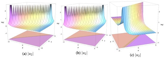 Figure 2 represents solutions (34), due to the domain and singularity of the coth function, we plot the graph of . is the x-t plot, is the y-t plot, and is the x–y plot. The parameters for are , , , with bounds , . For : , , , with bounds , . For : , , , with bounds , . Given the same parameters, the x–t and y–t plots show identical profiles.