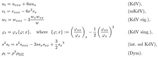 - Fuchssteiner, B.; Carillo, S. Soliton structure versus singularity analysis: Third order completely integrable nonlinear equations in 1+1 dimensions. Physica 1989, 154, 467–510. [Google Scholar] [CrossRef]