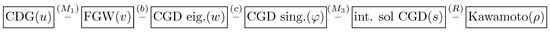 The Caudrey–Dodd–Gibbon–Sawada–Kotera eigenfunction equation (CGD eig.) (see Figure 5) that appears in the Bäcklund Chart is boxed to stress that this equation, to the best of our knowledge, does not appear in any list of integrable 5th-order nonlinear evolution equations. The other equations, in the 5th-order Bäcklund Chart (see [] and references therein) are well-known ones [,,].