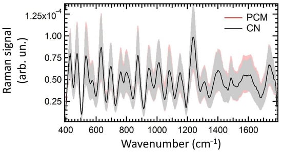 In Figure 1, we report the averaged Raman signal associated with PCM and CN. The most relevant detail observable from the qualitative analysis of this graph is the strong overlap between the two signals, as testified by the averaged signal and the corresponding standard deviation, which is represented here as shaded areas. This outcome can be seen as further proof of the inadequacy of a qualitative approach aimed at distinguishing the two classes, CN and PCM. The lack of distinct spectral bands with significant intensity differences between CN and PCM indicates that a Machine Learning (ML) model’s classification power must depend on the combined statistical data from multiple spectral components. This suggests that highly non-linear ML models are the best candidates for high classification accuracy. This conclusion is supported by the performance of the models in this study. Linear models like LDA, QDA, and SVM performed similarly, with accuracies too low for reliability. In contrast, the highly non-linear Random Forest Classifier (RFC) achieved the best results, with accuracy reaching approximately 80–89, as reported in Table 1.