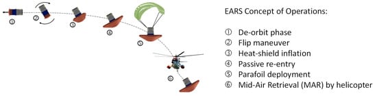 Figure 1 shows the CONOPS of the EARS spacecraft: At the end of the mission, the spacecraft is deorbited and its rear part pointed in the direction of flight in order to decrease the velocity. A flip maneuver is then performed, and the heatshield is inflated to protect the spacecraft within its wake. Passive re-entry into the atmosphere occurs along a ballistic trajectory, followed by a deceleration phase implemented by means of a parafoil. Finally, a helicopter recovers the spacecraft and its payload through a Mid-Air Retrieval (MAR) maneuver.