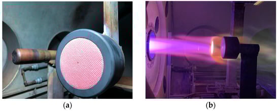 Plasmatron tests on Flexible Thermal Protection System (FTPS) materials: (a) test sample (Refrex® 1420) before test; (b) stagnation test running on the material inside the Plasmatron.