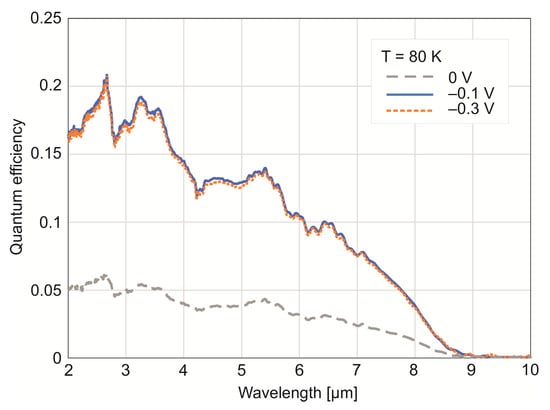 Quantum efficiency (QE) as a function of wavelength for different bias voltages at a temperature of 80 K.