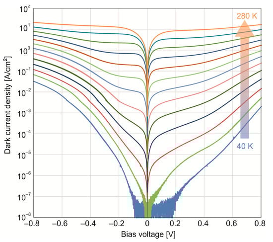 The dark current density versus voltage plots measured over a wide temperature range are presented in Figure 2. Each curve corresponds to a specific temperature from 40 K to 280 K in 20 K steps. The measurements were performed symmetrically in forward and reverse bias. The barrier structure reduces the tunneling and GR currents but does not eliminate them completely. This is better visible in the diagram for the dark current density versus temperature (Figure 3).