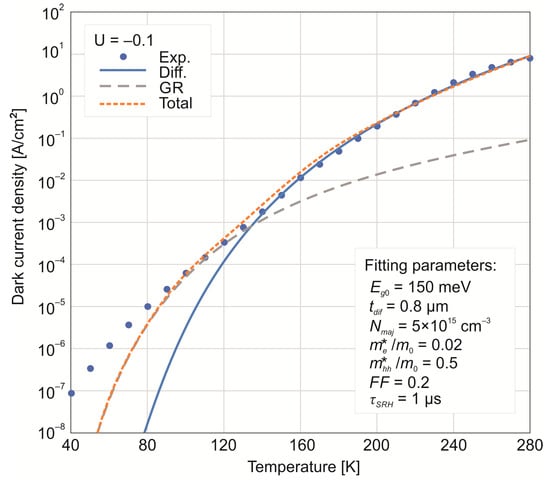 The experimental results were fitted with an analytical model that takes into account the diffusion and GR currents. The diffusion current arises from the thermal generation of carriers in the undepleted semiconductor, and its density can be expressed as