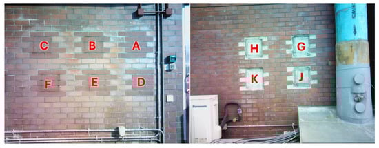 A west-facing sample wall with ground truths was constructed at the rooftop of the Industrial Centre on PolyU’s campus. Ten low-density polystyrene foam plates with an area of 400 cm2 were embedded in the sample wall. Six of them were covered with reddish-brown wall tiles and rendering, while four of them were covered with rendering only (Figure 1). The thickness of the foam plates used in each debond ranged from 3 mm to 12 mm, and their corresponding cover depths ranged from 15 mm to 32 mm. To capture thermal images of the sample wall, a long-wave thermal camera (model: FLIR T650sc, 640 × 480 pixels, 30 Hz) was used. The distances between the thermal camera and the target surface were 2.8625 m, with a spatial resolution (IFOV) of 0.123 cm2, at Position A, and 3.406 m, with a spatial resolution (IFOV) of 0.174 cm2, at Position B. The experiments were conducted in a 24 h cycle, in which thermal images of the sample wall were taken once every 5 min, to evaluate the difference in temperature through a time-lapse analysis. Data was collected on two different sunny days with similar weather conditions.
