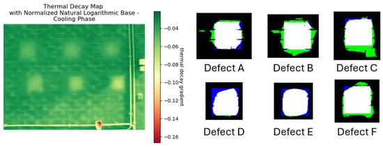 The left part of Figure 2 shows one of the resulting Thermal Decay Maps generated from the time-lapse thermal data taken at Position A. Two images were selected for generating the Thermal Decay Map: the first one was Frame 56, which was captured during the heat absorption period; the second one was Frame 174, which was captured during the heat dissipation period. From the resulting Thermal Decay Map, all six embedded defects can be distinguished. The right part of Figure 2 shows the comparison image between the binary image with the defects and the ground truth, in which white represents the correct prediction of defective area, black represents the correct prediction of intact area, and green and blue represent overestimation and underestimation of the suspected defect, respectively.