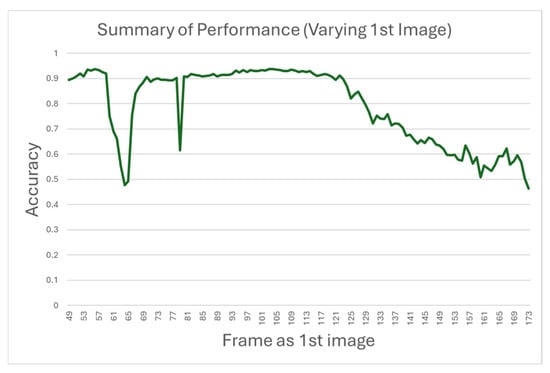 For the selection of the first image to be used for creating the Thermal Decay Maps, Figure 3 shows a summary of the performance of the defect detection and size estimation when thermal images taken at different times were used as the first image, and the thermal image captured at midnight (Frame 174, i.e., during the heat dissipation period) was used as the second image for generating the Thermal Decay Map. It showed that using the images taken during the heat absorption period as the first images results in higher accuracy, which could be above 0.9. The accuracy decreased if the images taken during the heat dissipation period were used as the first images.
