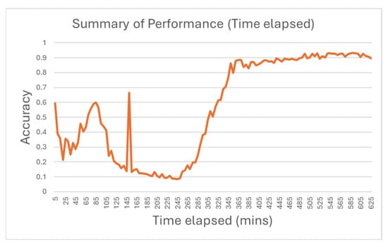For the required time elapsed between the two images, Figure 4 shows a summary of performance, which indicates that the required time elapsed should be more than 345 min to achieve an accuracy above 0.8.