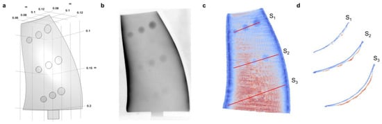 To systematically evaluate the detection effectiveness of photothermal 3D tomography for MAM part, a 316L stainless steel blade simulated sample with a length of 130 mm, featuring variable width, variable thickness, and variable curvature, were selected for photothermal 3D tomography detection. The sample was processed using selective laser melting (SLM) forming technology, and its surface was sandblasted to remove burrs. The sample contains 9 circular LOF defects parallel to the surface, the diameters of the defects in the three columns from left to right along the projection direction are 8 mm, 9 mm, and 10 mm, while the depths of the defects in the three rows from top to bottom are 0.4 mm, 0.8 mm, and 1.2 mm, and the thickness of all defects is 0.5 mm.