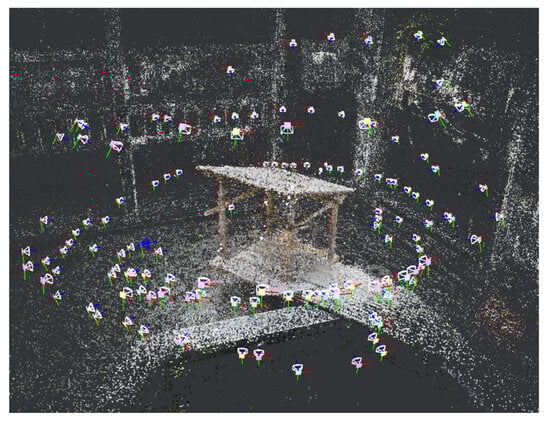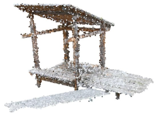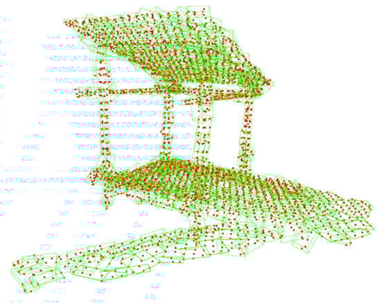 The sequential process of generating an optimized, collision-free UAV trajectory for architectural inspections is presented as follows. Initially, multiple 3D point clouds are captured from various UAV positions around the target architecture using a UAV-mounted 3D camera. As shown in Figure 1, these individual point clouds are then combined into a comprehensive and precise 3D model of the structure using advanced 3D reconstruction techniques, specifically the Structure from Motion (SfM) [] approach implemented in the open-source software Meshroom 2024 [].