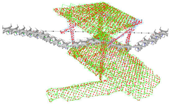 The detailed 3D point cloud usually consists of a vast number of data points, significantly complicating real-time trajectory calculations and collision avoidance tasks. To overcome this issue, a density-based spatial clustering method (DBSCAN) [] is applied to filter out noise and irrelevant data points, effectively reducing the dataset complexity. The filtered 3D point cloud of the architecture is shown in Figure 2.