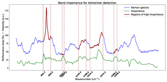 - Alzheimer’s: Performance drop threshold: 30%. Key regions: 904–956 cm, 1146–1198 cm, and 1224–1313 cm peaks.