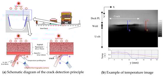Figure 1a shows a schematic diagram of the principle of detecting through-bead cracks by the temperature gap method. Solar radiation conducts heat from the pavement surface to the deck plate and U-rib. When a crack exists in the weld, the micro voids formed in the crack impede heat conduction, resulting in a temperature difference (temperature gap) compared to the normal area. By visualizing the temperature gap with infrared thermography imaging, the presence of cracks can be detected nondestructively and without contact.