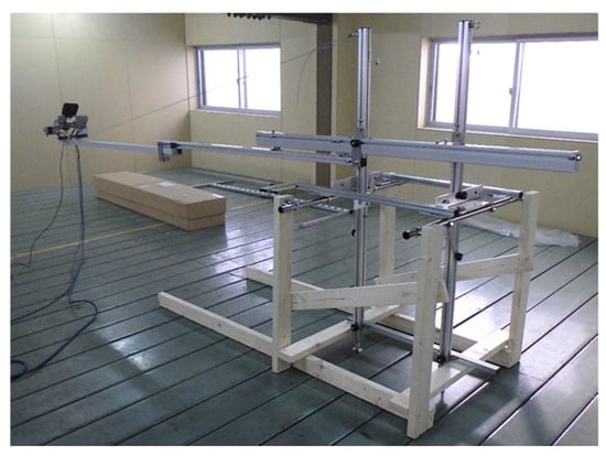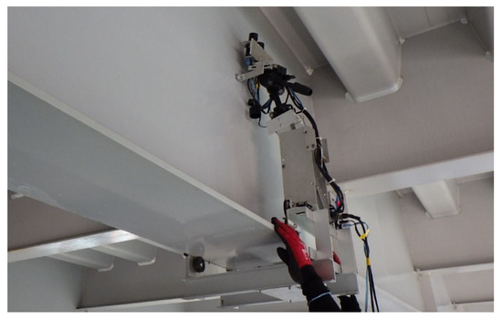 In areas where the inspection zone is near the orthotropic steel deck stringer, applying the guide rail system described in Section 3.2 is challenging due to limited space for equipment installation. To address this, a jig has been developed that enables the inspection device to travel along the lower flange of the stringer, and an image-capturing system near the stringer (Figure 4) has been made for continuous image capture along the bridge axis. This system allows manual movement of the device along the stringer while capturing images continuously.