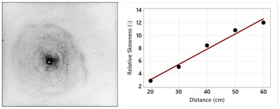 This study confirmed that selected statistical characteristics derived from flash-pulse thermographic inspection of GSR—particularly Relative Mean, Relative Skewness, and Indications Contrast—correlated well with firing distance and appeared to be promising parameters for its estimation. Despite considerable scatter in individual measurements, these derived characteristics showed a reasonably linear relationship with shooting distance. The variation in the radial distribution of GSR from the through-shot at different firing distances was not addressed in this work. This parameter remains a subject for further investigation, particularly due to its potential to improve distance estimation accuracy.