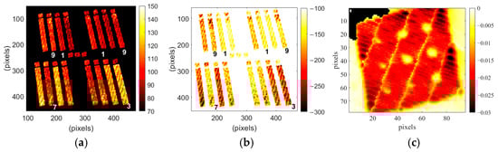 Figure 2c shows the slope map extracted in a double logarithmic scale, which highlights thermal features related to the cooling behavior during process monitoring of specimens with intentionally induced defects—specifically simulating keyhole porosity. As expected, in these defective areas, where scan speed is reduced and volumetric energy density (VED) is increased, the apparent temperatures are higher. This confirms the method’s potential for detecting small defects, approximately 1 mm in size.